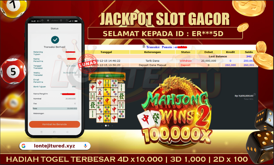Bukti JP MAHJONG WIN 2 – Kami mengucapkan selamat kepada bossku Username ID ER***5DÂ atas kemenangan di permainan SLOT MAHJONG WIN 2 dengan total kemenangan sebesar Rp20,000.000,00,- Kemenangan ini yang pastinya sudah dibayar LUNAS sesuai dengan bukti ya bossku. Lontejitu nih boss, berapapun kemenangan anda akan tetap kami bayar sampai tuntas ya boss.Â