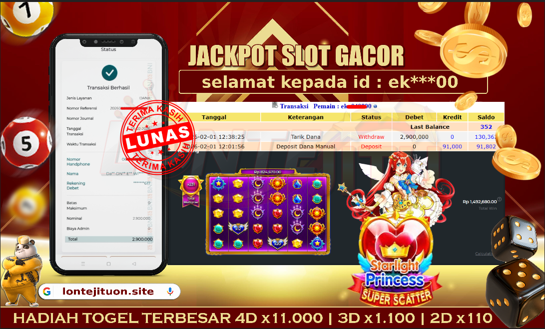 Bukti JP STARLIGHT PRINCESS 1,000 – Namun, yang kami posting ini sah dan real tanpa merekayasa yah dan hanya bertujuan untuk meningkatkan kepercayaan para member kami dan memberikan kenyamanan saat melakukan taruhan di situs kami, Jadi bosku tidak perlu khawatir  BERAPAPUN KEMENANGAN KALIAN PASTI DIBAYAR LUNAS !!  . Teman – teman sekalian sudah daftar di  LONTEJITU  belum yah..?, Jika belum jangan tunggu lagi, ayo segera daftarkan dan mainkan game  SLOT GACOR  kami yang sedang  ONFIRE  ini bisa jadi saudara / saudara salahsatu orang beruntung yang akan  JP PAUS  berikutnya nih!!.